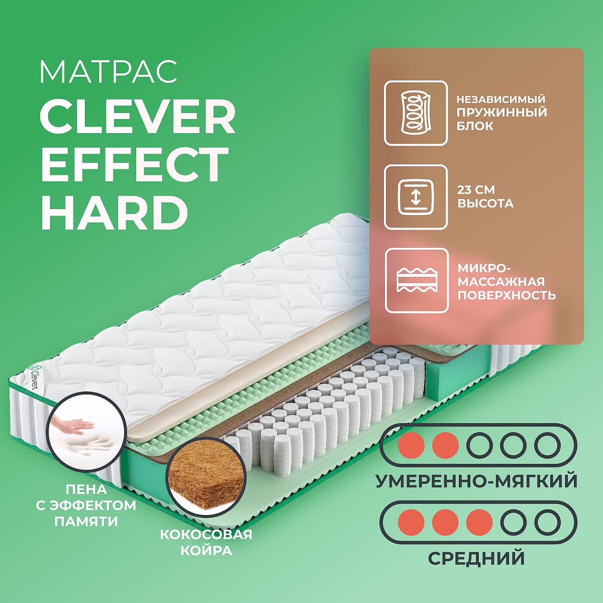 Нагрузка на спальное место, кг: 110. Высота, см: 23. Матрас скручен в рулон. За основу в матрасе Effect Hard взят блок независимых пружин TFK. На каждое спальное место приходится 500 пружин. Независимость хода пружин достигается путем помещения каждой пружины специальный чехол, поэтому пружины не имеют жесткого соединения друг с другом, а это значит, что сжимаются только те элементы на которые идет непосредственная нагрузка. Матрас имеет два эффекта: с одной стороны использован наполнитель с рельефной нарезкой, он служит для обеспечения микромассажа во время сна или отдыха. Сторона является умеренно-мягкой. Вторая сторона имеет среднюю жесткость и способна принять тело “как есть”, она обладает эффектом памяти и выполнена с помощью материала “Мемори”. Также одна сторона имеет кокосовую прослойку для усиления жесткости. Все материалы не вызывают аллергии, обладают высокой степенью износостойкости, не впитывают влагу и хорошо пропускают воздушные потоки.