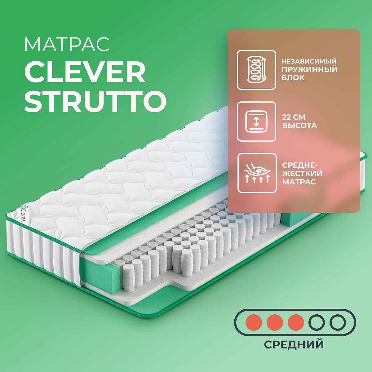 Матрас «Clever Strutto» — средней жесткости, которая подходит большинству людей среднего телосложения. Это — универсальный выбор и детям, и взрослым, и пожилым людям.