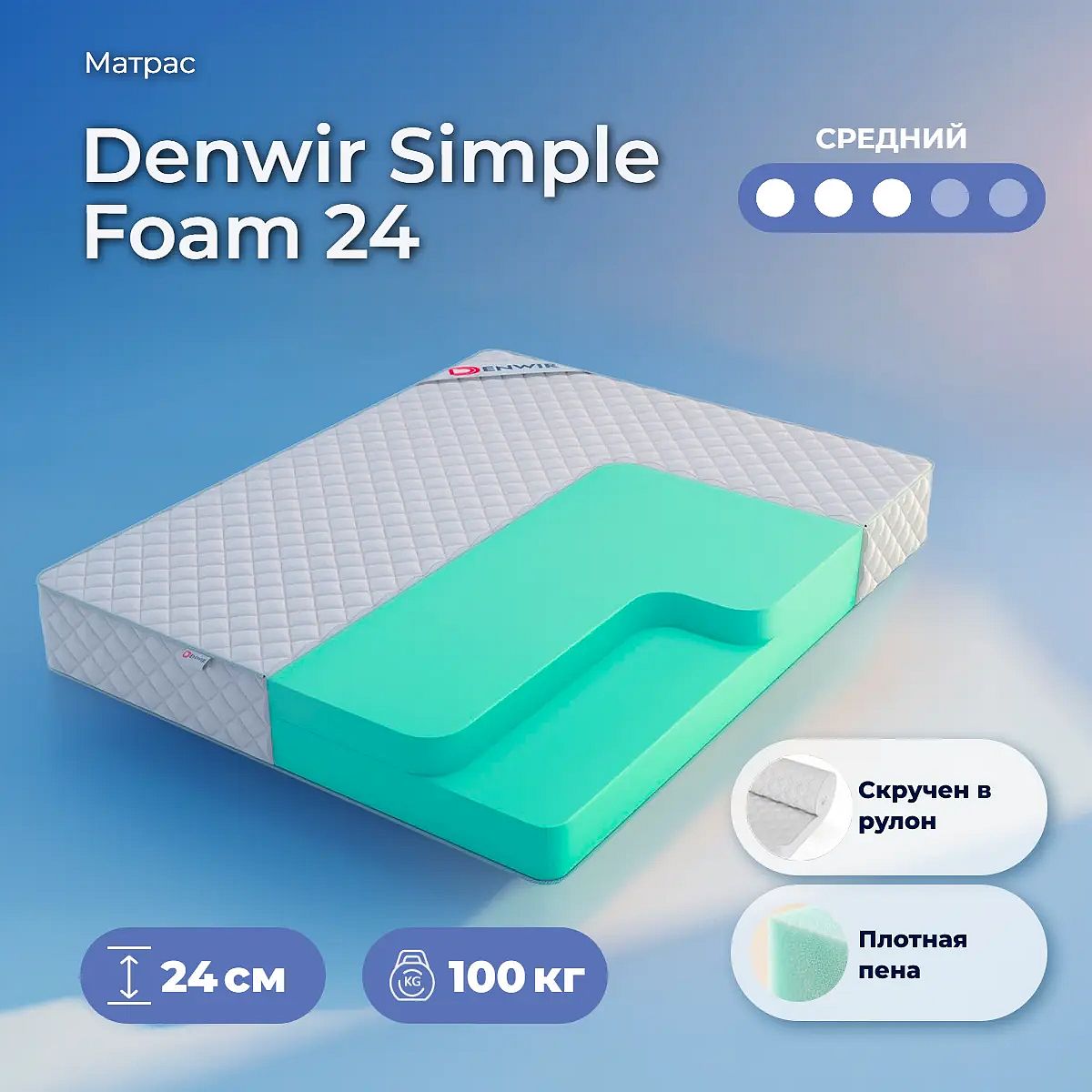 Матрас «Denwir Simple Foam 24» — средней жесткости, которая подходит большинству людей среднего телосложения. Это — универсальный выбор и детям, и взрослым, и пожилым людям.