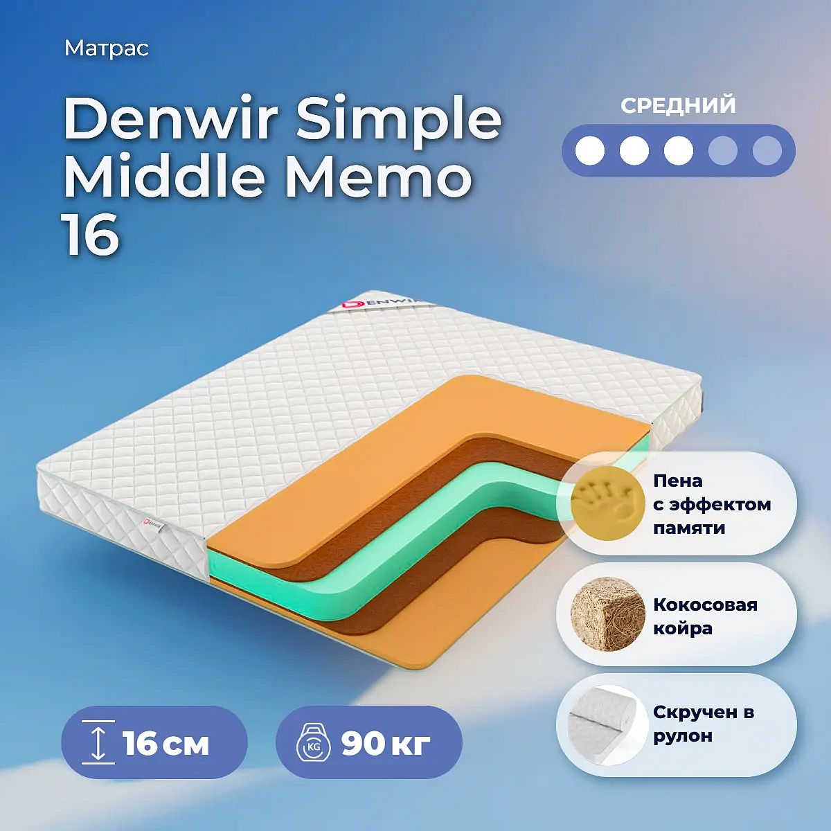 Матрас «Denwir Simple Middle Memo 16» — средней жесткости, которая подходит большинству людей среднего телосложения. Это — универсальный вариант и детям, и взрослым, и пожилым людям.