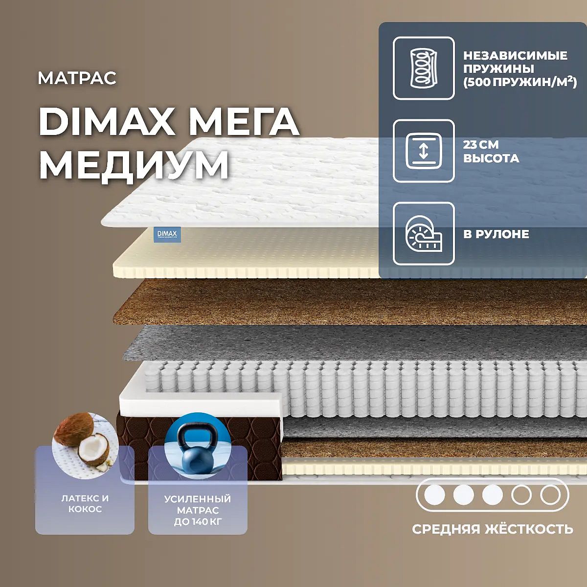 Уровень жесткости: средний. Наполнение моделиМодель Мега Медиум состоит из проложенных по обеим сторонам слоев кокосовой койры и натурального латекса. Оба материала являются гипоаллергенными и абсолютно безопасными для здоровья. Они гигиеничные и не имеют запаха. Кокос - жесткий, а латекс – мягкий. Кокос создает надежную основу для позвоночника и всего тела, а латекс обеспечивает комфорт и максимальное расслабление тела.Действие пружин S1000В основе модели проложен независимый пружинный блок S1000, в котором по 500 микропружин на 1 кв. метре. Каждая пружина помещена в специальный чехол из особо прочного материала и точечно воспринимает нагрузки. Пружины создают комфортную поверхность, на которой спящий может расслабиться и хорошо выспаться.Чехол из трикотажаКрасивый и уютный чехол для матраса изготовлен из нежного трикотажа. Спальная поверхность украшена объемной стежкой по сразу двум воздушным наполнителям – ППУ и холлкону. Такая комбинация создаёт дополнительный комфорт и мягкость.Боковая часть чехла выполнена из износостойкой мебельной ткани темно-коричневого цвета и простегана на ППУ для улучшения жесткости и устойчивости матраса. Продуманная обивка отвечает не только за удобство спящего, но и гарантирует, что матрас на долго сохранит свой нарядный внешний вид. Высота модели составляет 23 см, рекомендованная нагрузка – до 140 на спальное место. Защита матрасаДля защиты поверхности от пятен от пролитых жидкостей, грязи и пыли рекомендуем купить дополнительно защитный чехол или водонепроницаемый наматрасник.Другие моделиПосмотрите также жесткую модель с кокосом - Dimax Мега Медиум Хард - и мягкую модель с латексом - Dimax Мега Медиум Софт.Скрутка в рулонПо умолчанию матрас поставляется в развернутом виде. По вашему желанию матрас может быть доставлен в скрученном виде.При доставке транспортной компанией матрас всегда скручивается в рулон. Хранение матрасов в скрутке должно осуществляться: