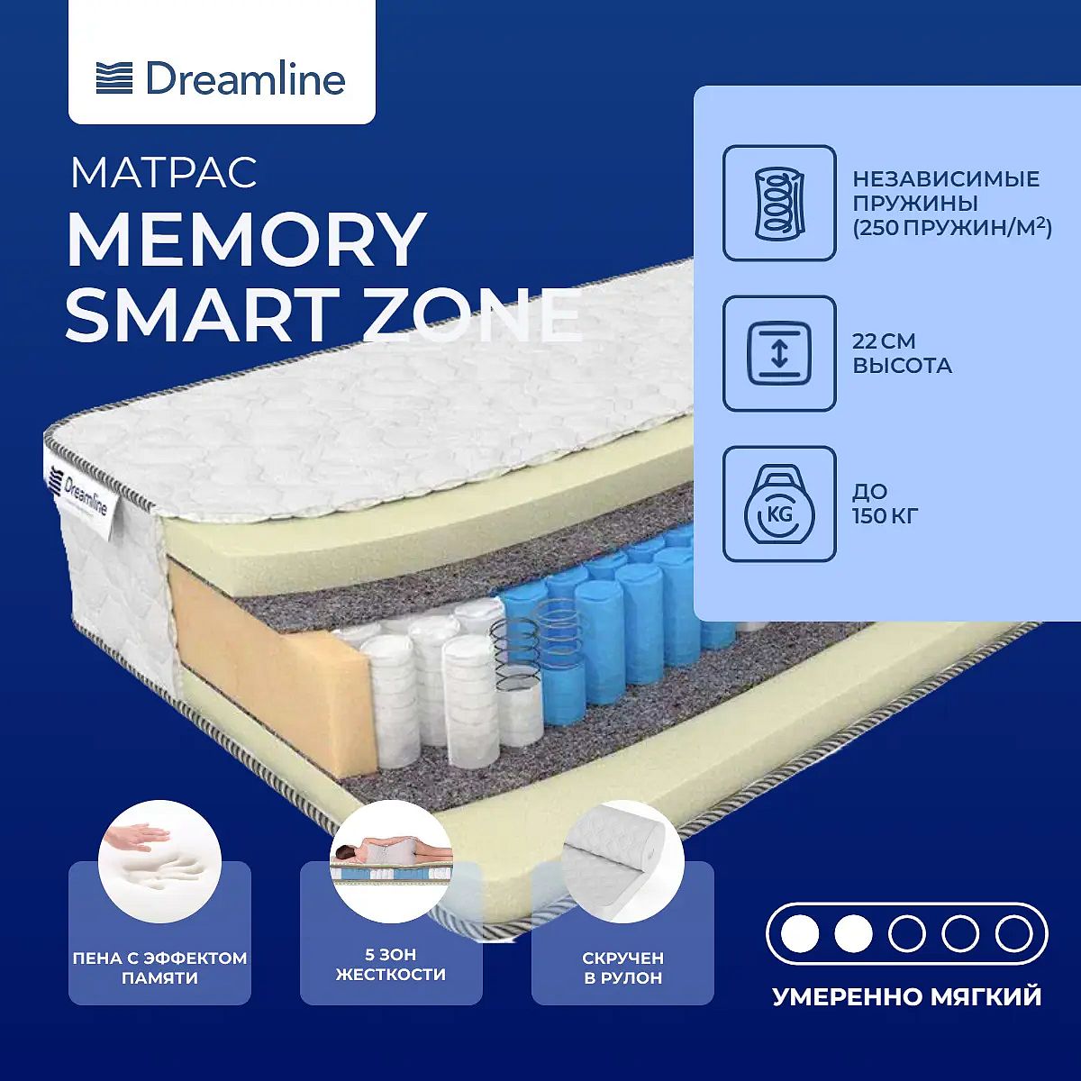 Мягкий матрас на зональном пружинном блоке с мемориксом. Материал с эффектом «памяти формы»Меморикс – это материал с эффектом «памяти формы». Он обладает способностью восстанавливать свою форму и возвращаться в первоначальное состояние. Материал очень упругий, он повторяет все изгибы тела, к тому же, хорошо пропускает воздух.Действие пружин по зонамМатрас построен на зональном блоке – это разделение пружин по зонам жесткости. Наиболее усиленные – плечевая зона и поясничная. Воздействие приходится на каждую зону и каждую точку тела спящего.Чехол из трикотажаЧехол выполнен из нежнейшего гипоаллергенного трикотажа.Защита матрасаЕсли вы заботитесь о чистоте и свежести вашего спального места рекомендуем купить также защитный наматрасник-чехол или водонепроницаемый наматрасник.Скрутка в рулонПо умолчанию матрас поставляется в развернутом виде. По вашему желанию матрас может быть доставлен в скрученном виде.Другие моделиЖесткость модели – умеренно-мягкая. Также вы можете посмотреть похоже модели – Dreamline Memory Smart Zone и Dreamline Soft Smart Zone.