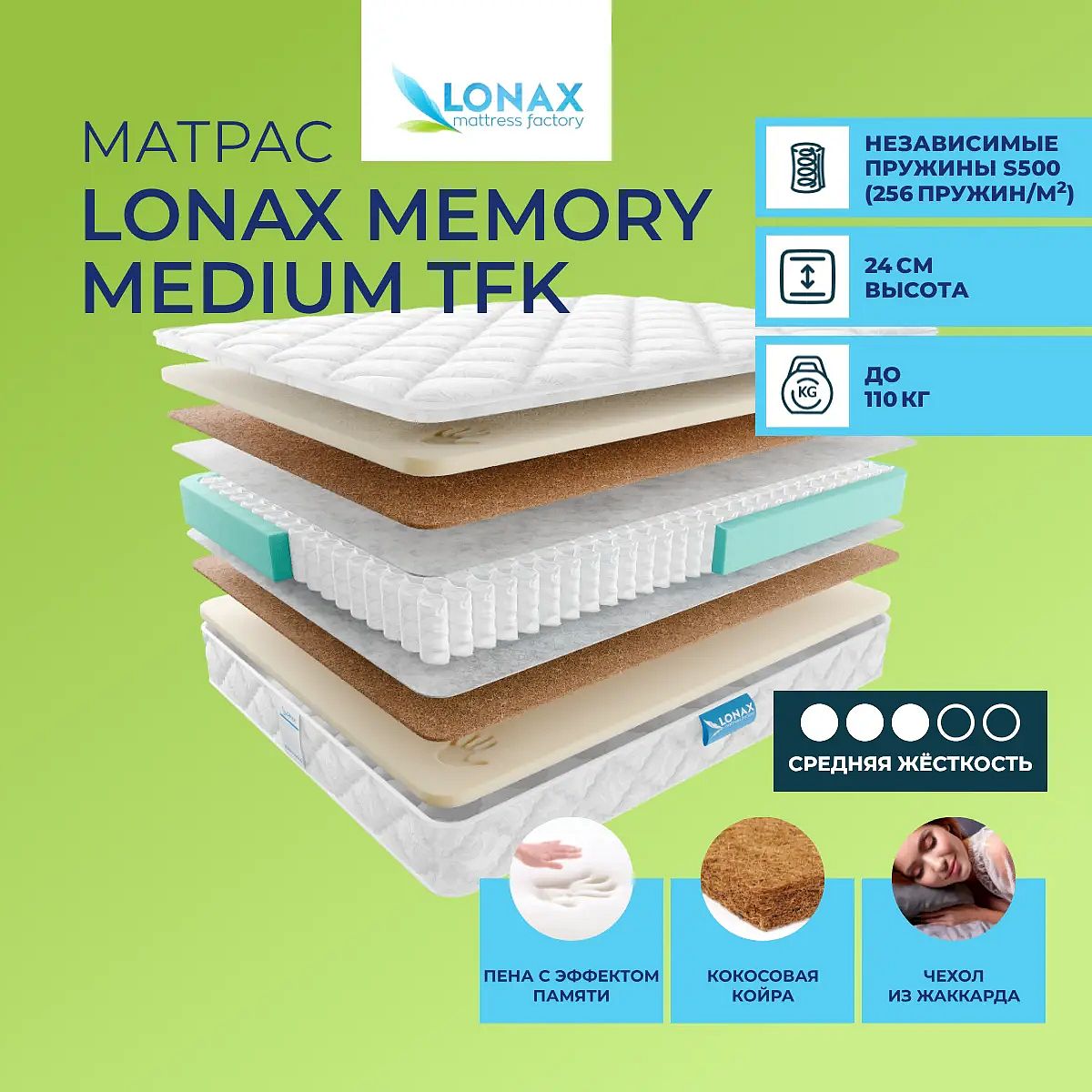 Матрас «Lonax Memory Medium TFK» — средней жесткости, которая комфортна большинству людей среднего телосложения. Это — оптимальный вариант и детям, и взрослым, и пожилым людям.