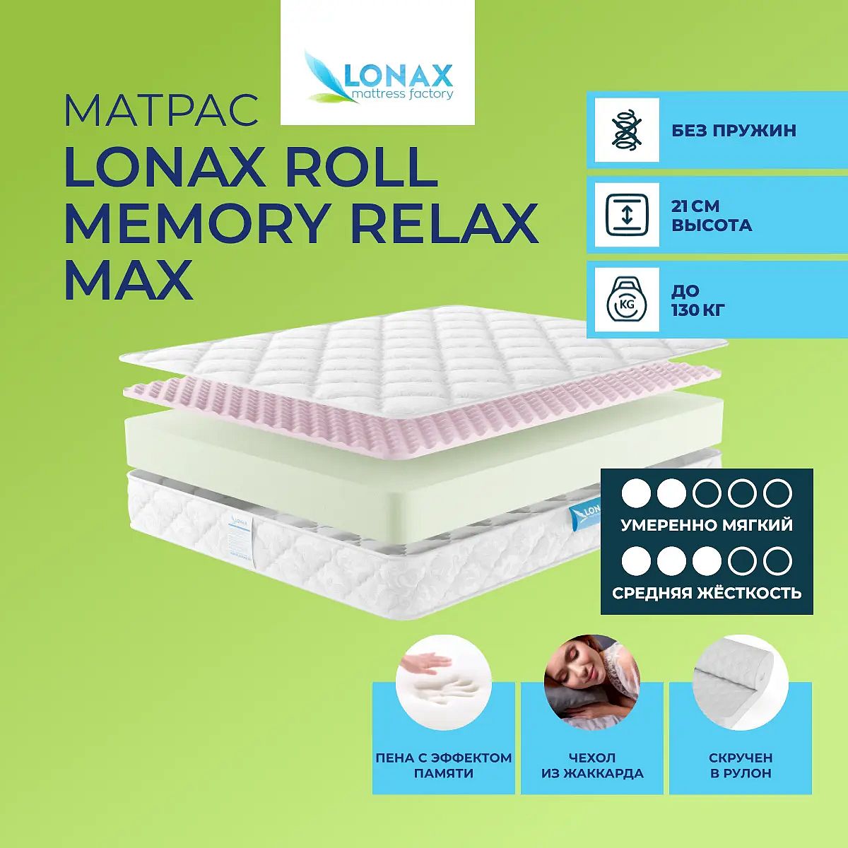 Матрас Lonax Roll Memory Relax Max создан для комфортного и спокойного сна. Беспружинная конструкция обеспечивает надежную поддержку, а разная жесткость сторон позволяет выбрать подходящий вариант для разных ощущений. Одна сторона умеренно мягкая с наполнителем мемориформ 3 см, вторая — средней жесткости на основе пенополиуретана высотой 18 см. Высота матраса составляет 21 см, что делает его удобным для большинства кроватей. Чехол выполнен из натурального хлопкового жаккарда — приятная на ощупь ткань с хорошей воздухопроницаемостью и аккуратным внешним видом. Мемориформ мягко подстраивается под контуры тела, снижая давление и обеспечивая дополнительный комфорт во время сна. Матрас выдерживает нагрузку до 130 кг на спальное место и подходит для ежедневного использования. Характеристики