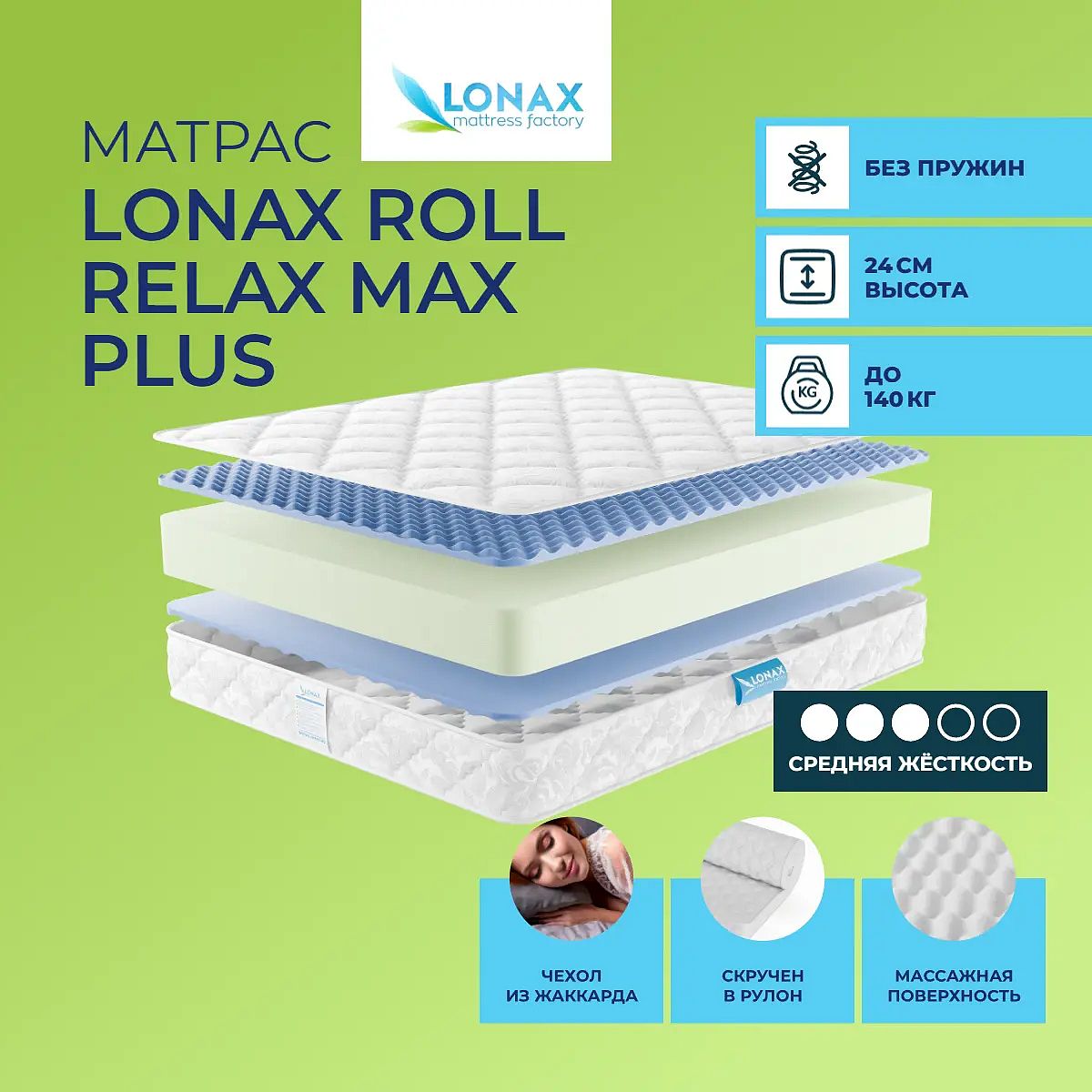 Матрас «Lonax Roll Relax Max Plus» — средней жесткости, которая комфортна большинству людей среднего телосложения. Это — оптимальный выбор и детям, и взрослым, и пожилым людям.