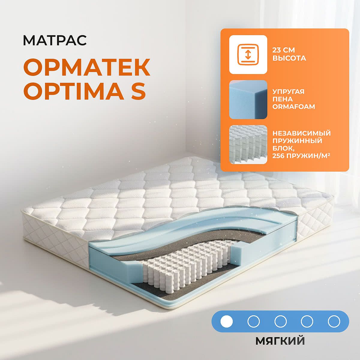 Матрас Орматек Optima S — это мягкий пружинный матрас для комфортного сна, выполненный на основе блока независимых пружин EVS 500 и современных материалов Ormafoam. Благодаря сочетанию эластичной пены и независимых пружин матрас обеспечивает расслабление и точную поддержку тела, подходит для ежедневного использования и особенно ценится теми, кто предпочитает мягкую поверхность. Высота матраса — 23 см, он выдерживает нагрузку до 130 кг на спальное место и допускает разницу в весе до 30 кг между спящими, что делает его удобным для пар. Чехол выполнен из мягкого трикотажа с вискозой, простёган на высокоэластичной пене и синтепоне, что придаёт дополнительную мягкость и приятные тактильные ощущения. Вискоза хорошо пропускает воздух, не накапливает статическое электричество и подходит даже для чувствительной кожи. Свойства