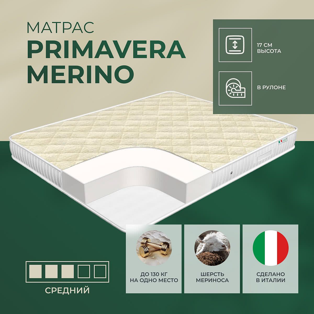 Матрас «Primavera Merino» — средней жесткости, которая подходит большинству людей среднего телосложения. Это — универсальный вариант и детям, и взрослым, и пожилым людям.