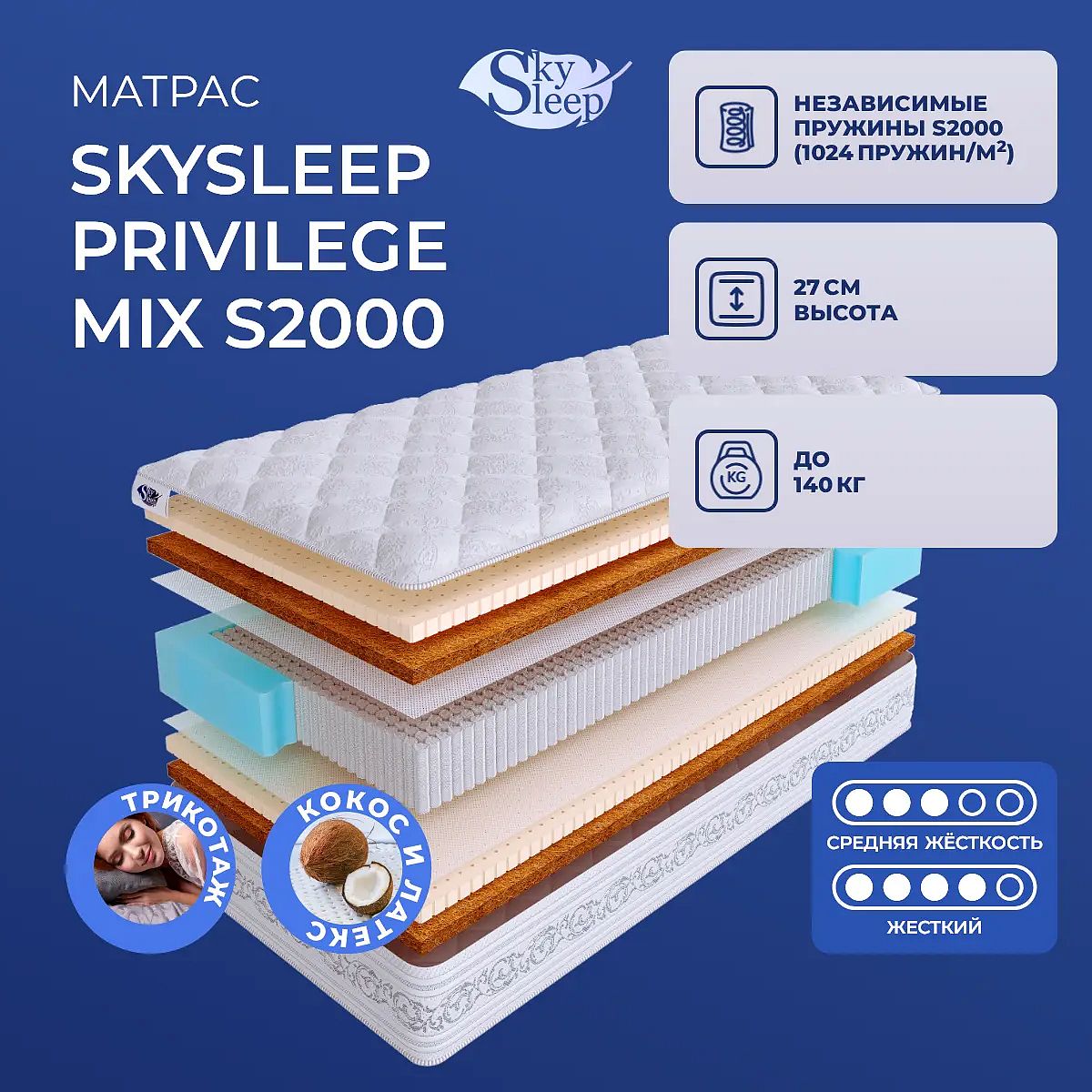 Матрас SkySleep Privilege Mix S2000 — выбор для тех, кто ценит комфорт люксового уровня и индивидуальный подход к отдыху. Две разные стороны с разной степенью жёсткости позволяют выбрать подходящее ощущение: одна сторона средней жёсткости, другая — более жёсткая. Высота 27 см обеспечивает выразительный объём и подчёркивает статус спальни. В основе — современный блок независимых пружин S2000 с плотностью 1024 пружины на м2, что гарантирует анатомичную поддержку и рассчитан на нагрузку до 140 кг на спальное место. Слои натурального кокоса и латекса (по 3 см с каждой стороны) создают гармонию упругости и эластичности, способствуя глубокому расслаблению во время сна. Чехол выполнен из объёмного хлопкового трикотажа, простёганного на шерстипоне (450 г/м2) — это изысканная отделка, приятная на ощупь, с отличной терморегуляцией. Ключевые особенности