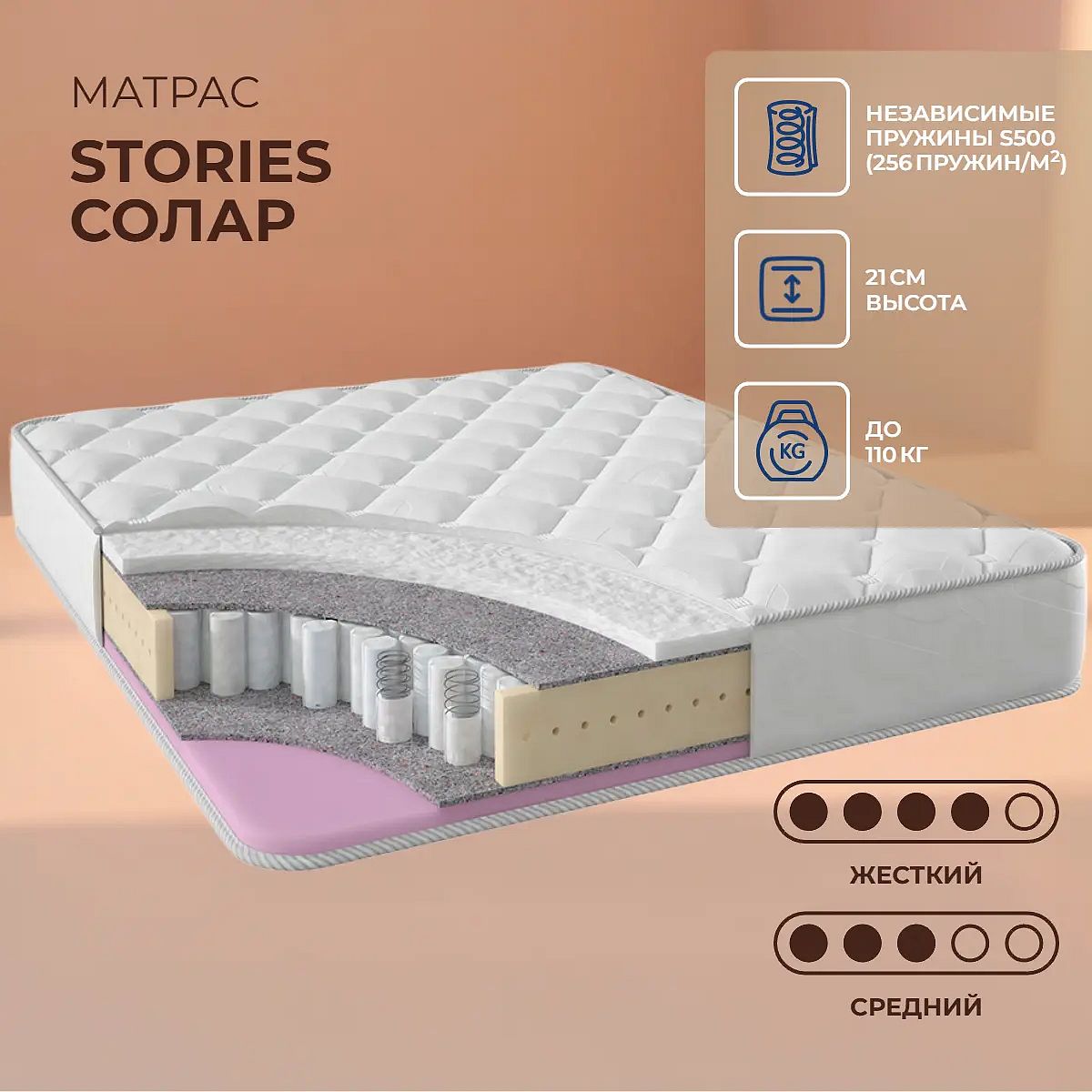 Матрас Stories Солар — это пружинный матрас с двумя разными по жёсткости сторонами: одна сторона обладает жёсткой поддержкой, другая — средней жёсткостью. Такая конструкция позволяет выбрать наиболее комфортный вариант сна, просто перевернув матрас. Высота 21 см обеспечивает удобную посадку на кровати для ежедневного использования. В составе матраса используется современный блок независимых пружин TFK с плотностью 256 пружин на м2. Такой блок обеспечивает точечную поддержку тела и равномерное распределение нагрузки, что особенно важно для качественного сна. С одной стороны расположен слой холлофайбера 3 см, обеспечивающий дополнительную упругость и комфорт, с другой — слой ППУ (пенополиуретан) 3 см для более мягкого ощущения. Между ними — термовойлок для прочности и долговечности конструкции. Чехол выполнен из хлопкового жаккарда с аккуратной стёжкой на холлконе (200 г), что добавляет матрасу мягкости и приятен на ощупь. Максимальная нагрузка на спальное место — до 110 кг, что делает этот матрас универсальным для большинства пользователей. Ключевые особенности