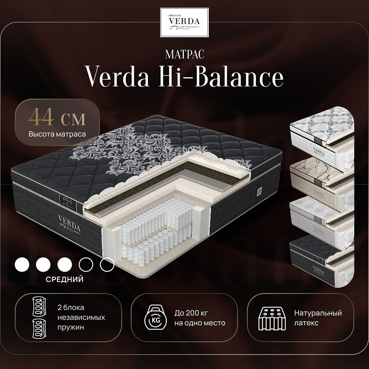 Односторонний матрас Verda Hi-Balance - модель класса «премиум» средней жесткости. За счет оптимального сочетания наполнителей, слоев натурального латекса и конского волоса, и двухуровневой системы поддержки этот матрас является идеальным для каждого. Этот матрас подарит расслабление и комфорт, независимо от ваших индивидуальных параметров. Его особенность это наличие системы пружинных блоков High End, в которую входят два блока независимых пружин. Вместе они обеспечивают максимально хорошую поддержку позвоночника и позволяют создать поистине роскошную модель матраса.Состав матраса: