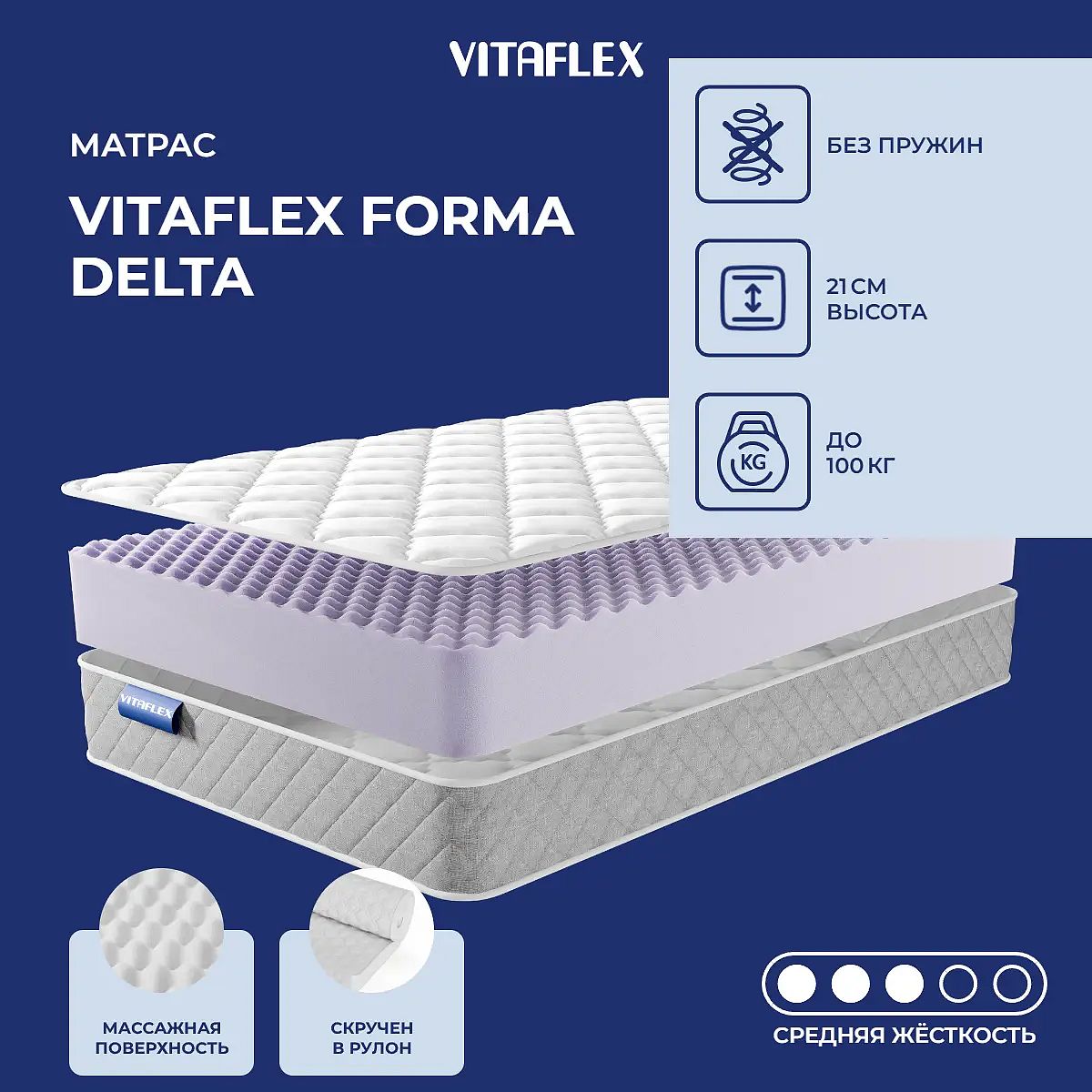 Матрас «Vitaflex Forma Delta» — средней жесткости, которая комфортна большинству людей среднего телосложения. Это — универсальный вариант и детям, и взрослым, и пожилым людям.