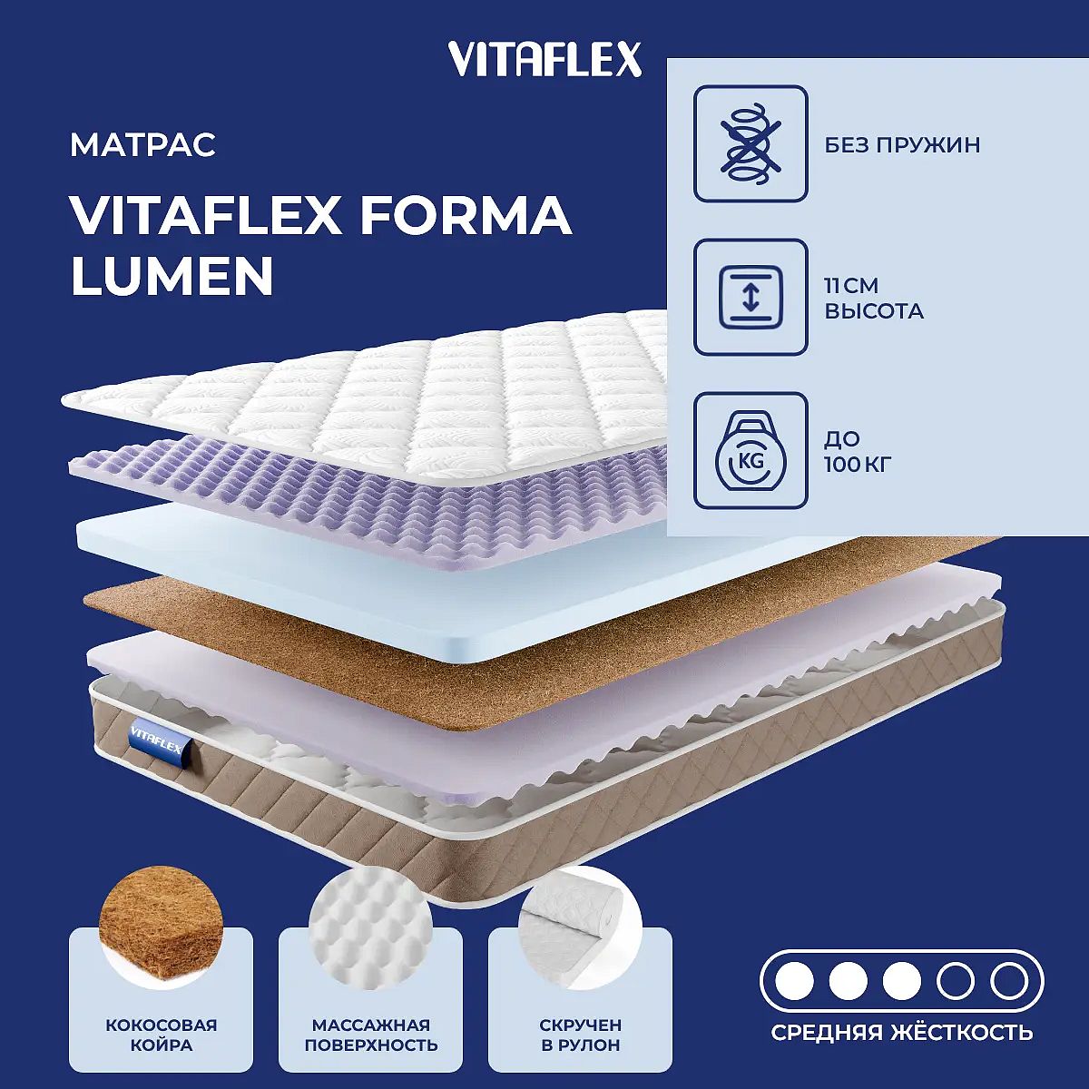 О производителеVitaflex — российский бренд, создающий практичные и современные матрасы для ежедневного комфортного сна. Модель Forma Lumen сочетает качественные материалы и проработанную конструкцию для вашего удобства.