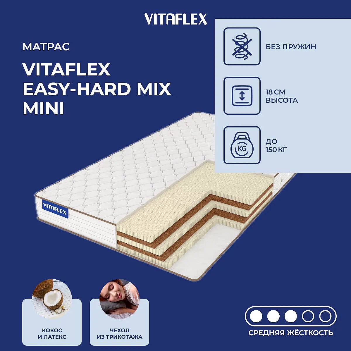 Матрас «Vitaflex Easy-Hard Mix Mini» — средней жесткости, которая комфортна большинству людей среднего телосложения. Это — оптимальный выбор и детям, и взрослым, и пожилым людям.