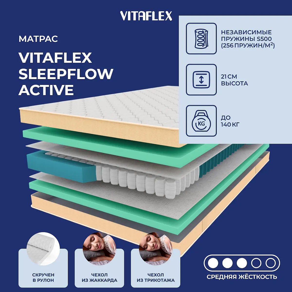 Матрас Vitaflex SleepFlow Active — это современный пружинный матрас средней жесткости, рассчитанный на комфортный сон и ежедневное использование. Благодаря продуманной конструкции с независимым пружинным блоком S500 (256 пружин на м2) он обеспечивает точечную поддержку тела и равномерное распределение нагрузки, что особенно важно для спокойного сна без эффекта «волны» и «гамака». Слои из высокоэластичного пенополиуретана (ППУ) толщиной 3 см с каждой стороны создают упругую и приятную на ощупь поверхность, а прослойки из войлока добавляют прочности и долговечности. Чехол выполнен из мягкого трикотажа, простёганного на синтепоне (100 г/м2), а нижняя часть — из хлопкового жаккарда, также простёганного на синтепоне. Бурлет из бежевой рогожки придаёт матрасу аккуратный внешний вид. Характеристики