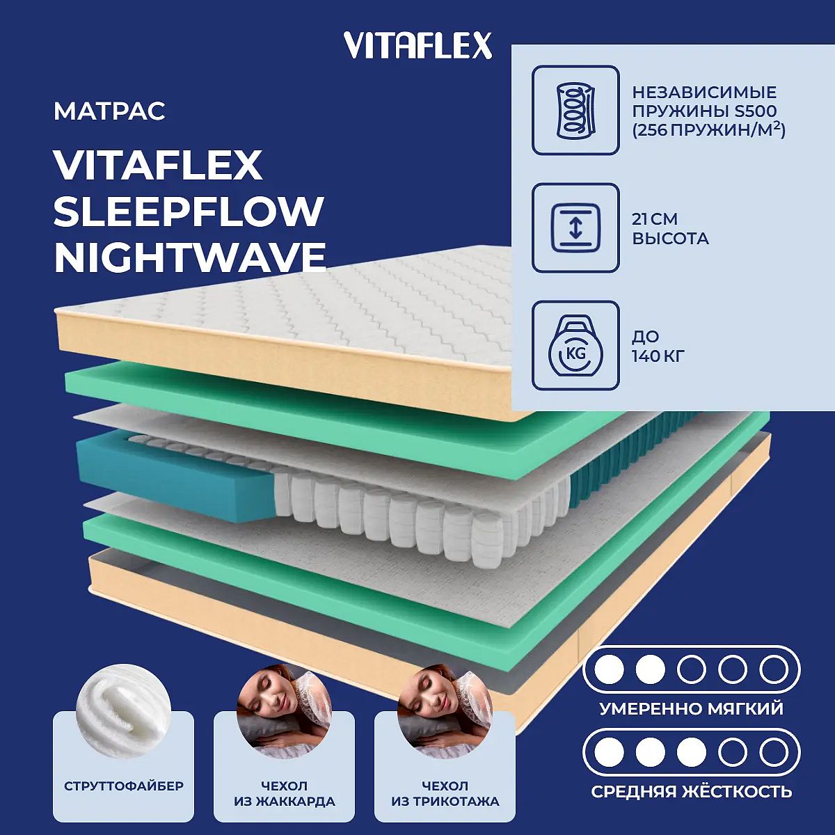 Матрас Vitaflex SleepFlow NightWave — это комфортный пружинный матрас с разной жёсткостью сторон для ежедневного сна. Одна сторона матраса — умеренно мягкая, другая — средней жёсткости, что позволяет выбрать подходящий уровень поддержки в зависимости от ваших предпочтений. Независимые пружины S500 (256 шт/м2) обеспечивают точечную поддержку и комфортное положение тела во время сна, а высота 21 см создаёт ощущение уюта и надёжности. С одной стороны используется слой ППУ толщиной 3 см, который равномерно распределяет вес и делает поверхность мягкой и упругой. С другой стороны — струттофайбер и периотек, обладающие хорошей воздухопроницаемостью и способностью сохранять форму даже при активной эксплуатации. Матрас выдерживает нагрузку до 140 кг на одно спальное место. Свойства